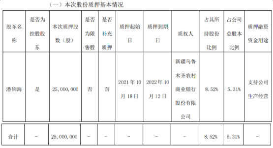 10月19日,汇嘉时代(证券代码:603101)控股股东潘锦海向新疆乌鲁木齐农村商业银行股份有限公司质押股份2500万股,用于支持公司生产经营。本