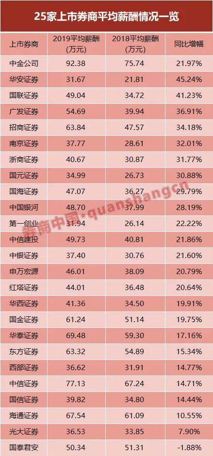 有9家券商的员工平均薪酬超过了50万元,其中最具国际基因的“投行贵族”中金公司平均薪酬也最高,达92.38万元,同比增加22%;行业龙头中信证券以平均77.13万元的人均薪酬位列第二,同比增幅约15%。此外,华泰证券、海通证券、招商证券、东方证券、国金证券的平均薪酬也均超60万元。