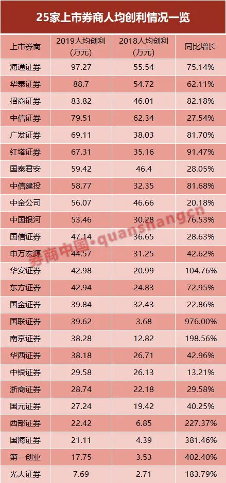 就人均创收情况来看,这25家上市券商中,有23家人均创收超100万,东方证券以330.08万元拔得头筹;人均创利来看,海通证券以97.27万元夺得头名。