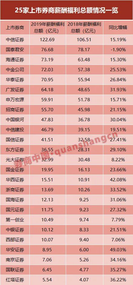 就已发放和计提的薪酬总额来看,中信证券、国泰君安、海通证券、中金公司、华泰证券暂居前五,单家公司薪酬福利总额均超70亿元。其中中信证券2019年的员工薪酬总额为122.69亿元,高居榜首。