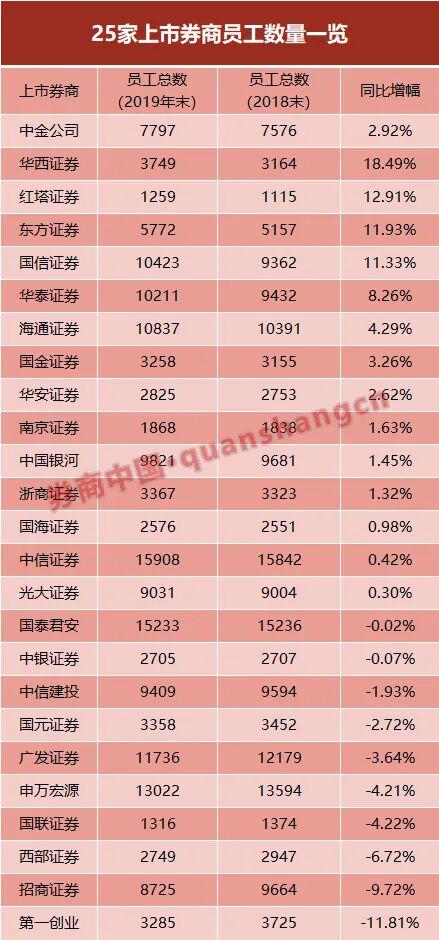 2019年,证券市场回暖,资本市场深化改革开启,利好频出,券商各项业务营收均同比明显增加,员工总薪酬福利可预见亦会“水涨船高”。同比来看,这25家券商中,只有上海地区一家总额微降,其他券商薪酬均有所增加。有9家券商薪酬福利总额同比增幅超三成以上,其中华安证券、华西证券的薪酬福利总额同比增幅超4成。